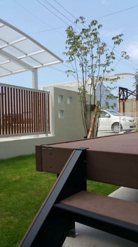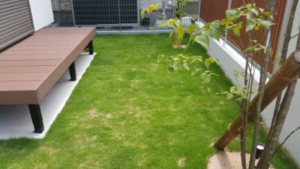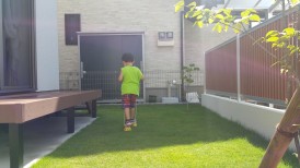 小さいお子さんが安全に安心して遊べるお庭は芝生とウッドデッキ。