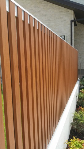 外構にも統一感ある木目調のフェンスで道路からの視線カット