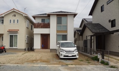 白色の清潔感ある外壁に木目調のフェンスがオシャレなお家