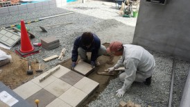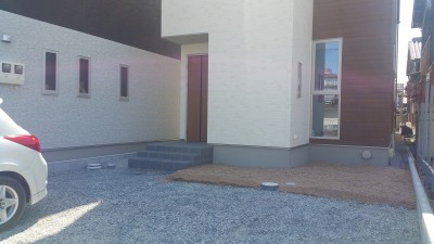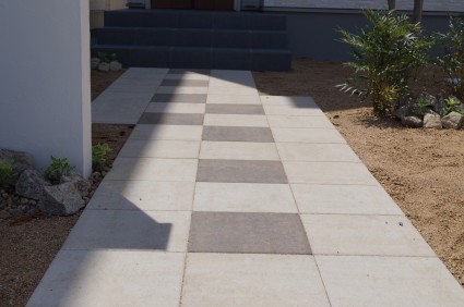 アプローチも白色の平板にポイントにブラウン色を入れた