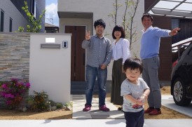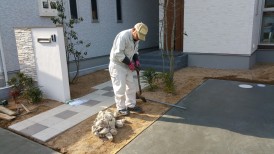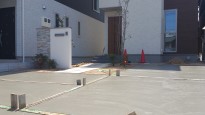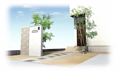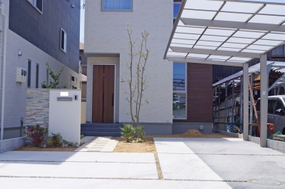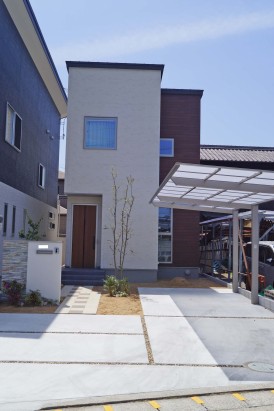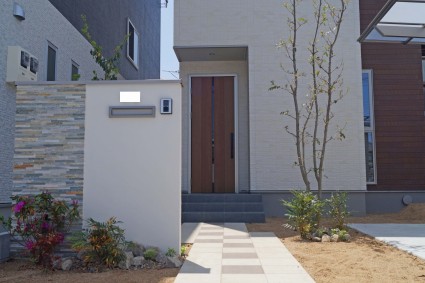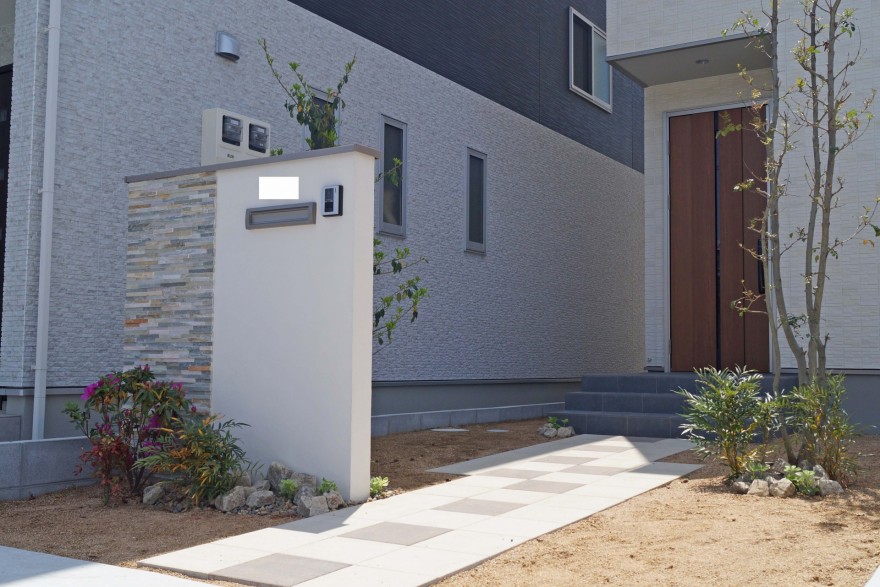 姫路市外構|アプローチは白をベースに外壁のブラウン色をポイントに取り入れ建物と統一感あるデザイン