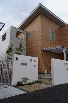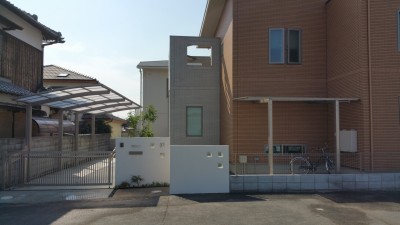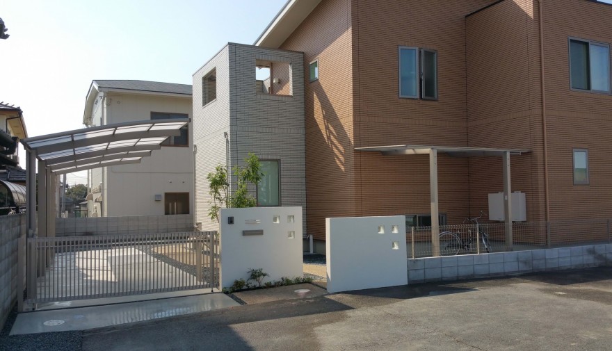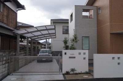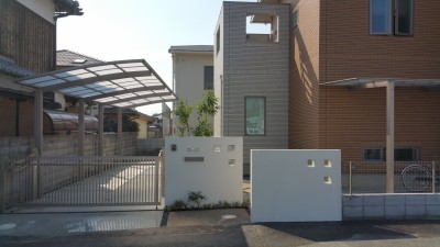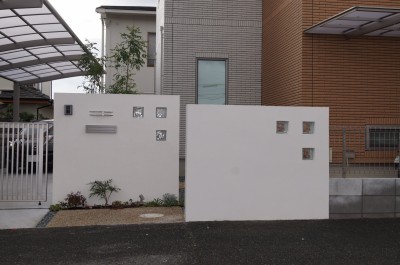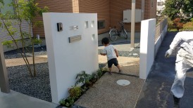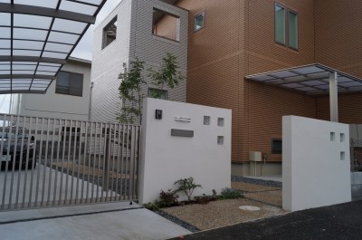 二枚の壁を交差する事で門扉を付けずにセミクローズな外構が出来ました。
