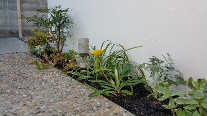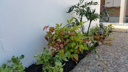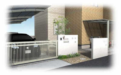 ・ 門柱の足元に植栽スペースを設けて門廻りを彩りを…