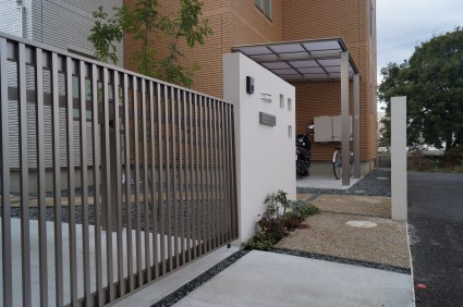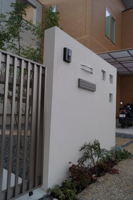 一枚の門柱を少し後退させる事により奥行感ある門廻りとなりました。