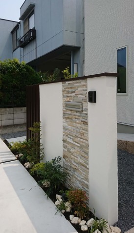塗り壁門柱に鮮やかなグリーンの植栽が