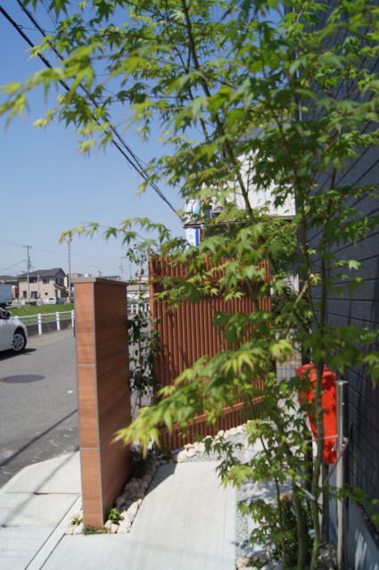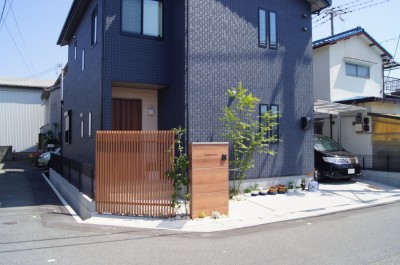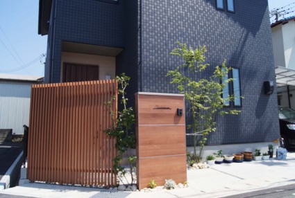 門柱と同色カラーの木調目隠しスクリーンを設置。