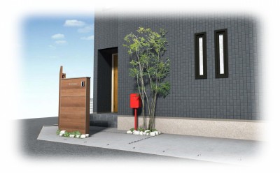 ウッド門柱が温かみと優しさを感じさせてくれる