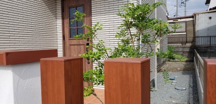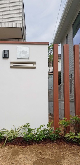 塗り壁門柱の笠木とアルミ角柱を明るい色合いの