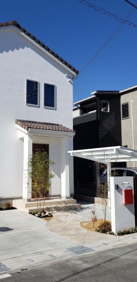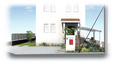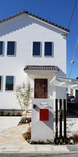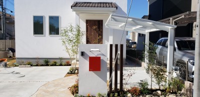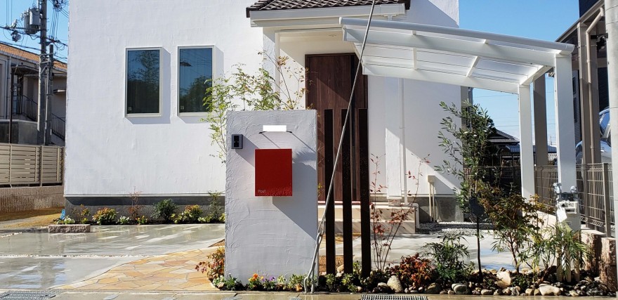 太子町外構|真っ白な塗り壁門柱と赤色ポストと植栽でオシャレな門廻り