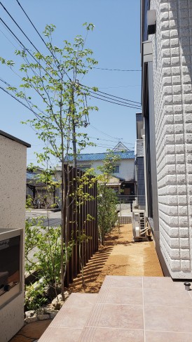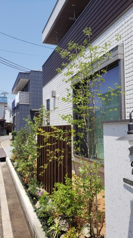 ウッド角柱の間からイロハモミジ絡めたナチュラル感。