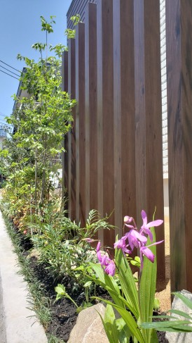 姫路市ヘーベルハウスに似合う外構|落ち着いた雰囲気の木目調スリットフェンスと植栽で素敵なお庭