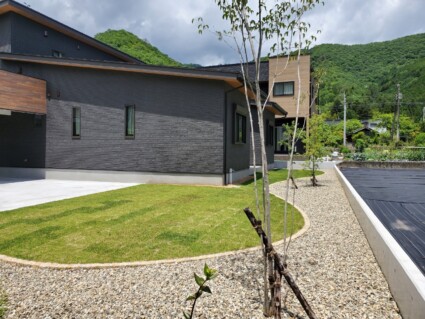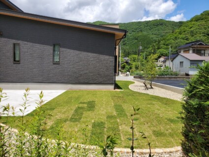 宍粟市山崎町和モダン住宅に似合う和モダン外構|防草シートで雑草対策した南向きの芝生のお庭