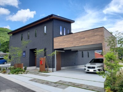ダークカラーとウッド調のモダン住宅
