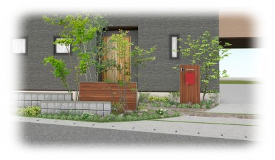 ウッド調の門柱と赤色ポストがアクセントに…。