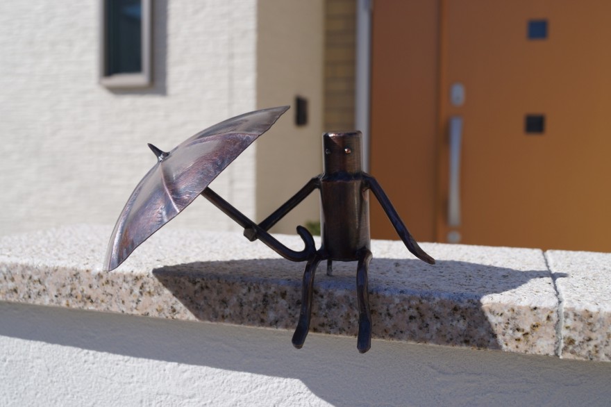 アイアンのオブジェがかわいい印象的な門まわり、傘をさして雨の日もお出迎え、その名も表札守り人です。
