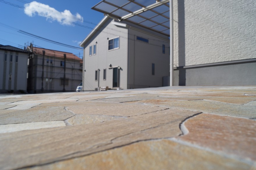 一枚一枚職人の手によって貼られたアプローチの石貼り。