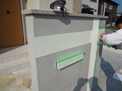 守り人がある門柱にはかわいいピンク系のモザイクタイルをクロスしてデザインし モザイクがかわいらしい門廻りになりました。