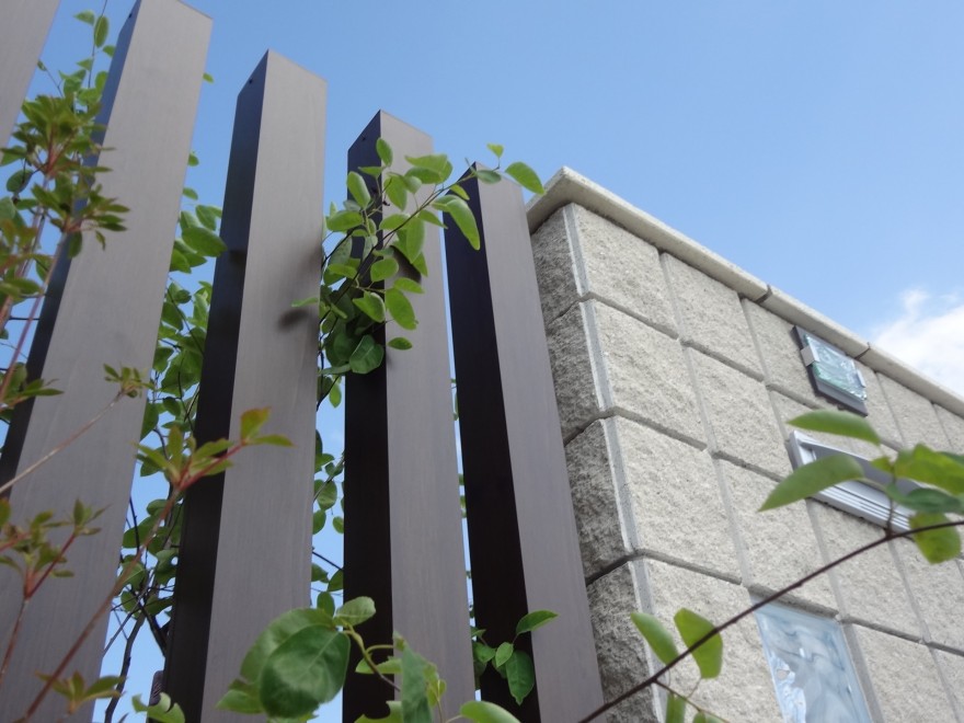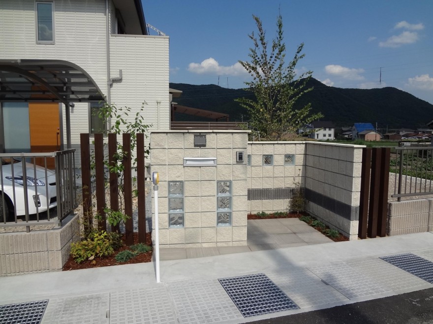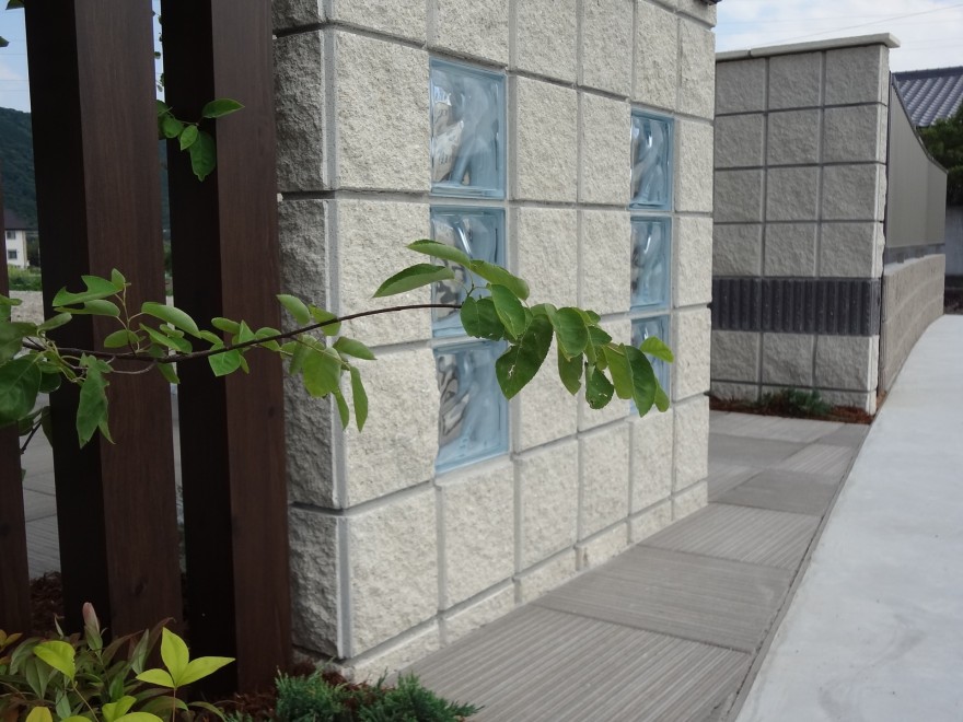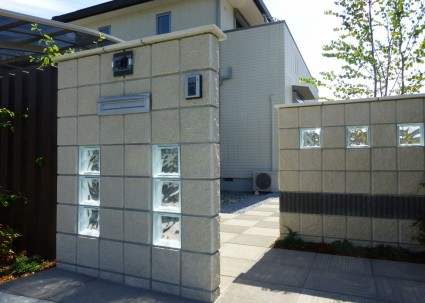 門柱で使用した同じブロックでボーダーやガラスブロックを組み入れたデザインです。