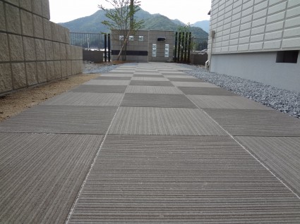 長いアプローチは市松模様に貼られたベガスで上質で重厚感のあるものになりました。