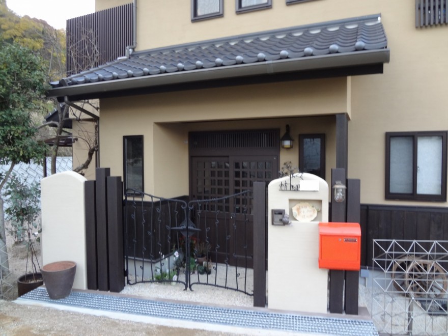塗り壁の門柱に角柱を組合せ門扉は三協立山のプロバンスでまとめています。