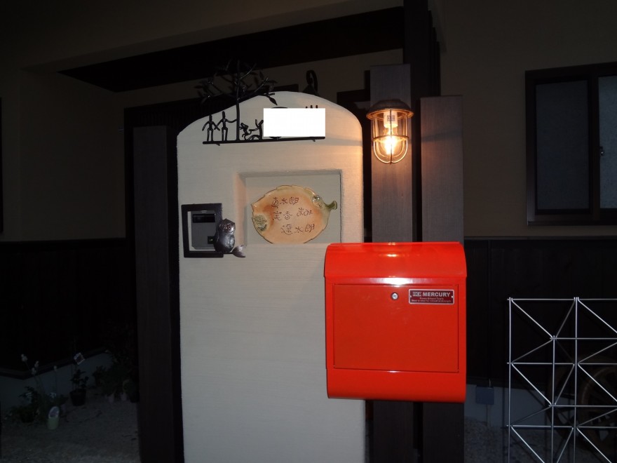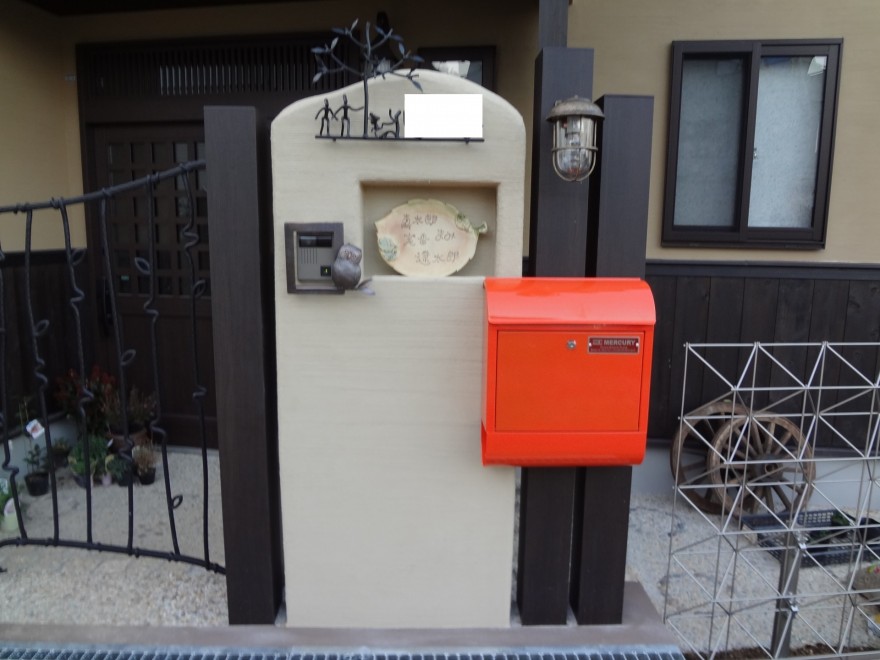 奥さまこだわりのアイアンの表札と陶器の表札を組み入れています。