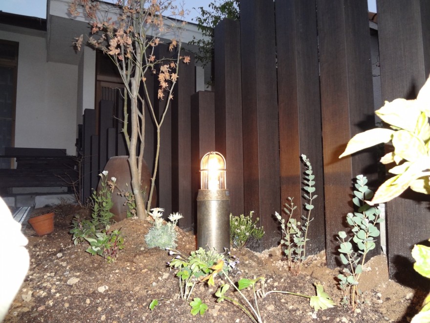 枕木風のアルミの角柱にマリンライトやオレンジのポストでアクセントをつけています。