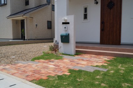 古レンガのナチュラル感あふれるアプローチに枕木をポイントに入れてアプローチを囲むように芝生を植えた