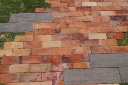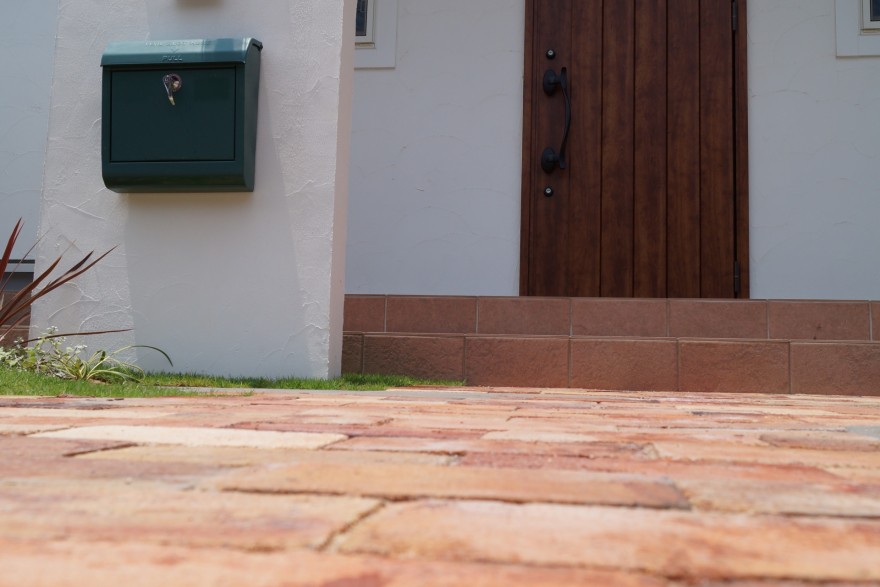 ビンテージレンガをランダムに敷き詰めてコンクリート製の腐らない枕木でアクセントを入れています。
