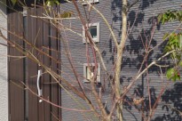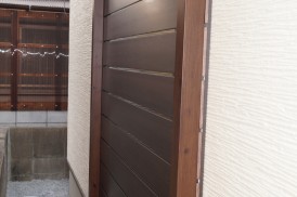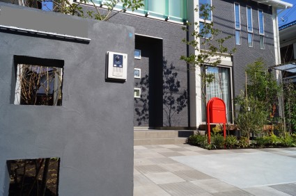 ハイグレードな住宅にあわせた門周りの門柱は同系色で落ち着きのあるダークな色調でまとめています。