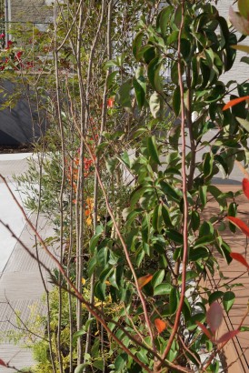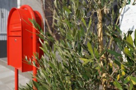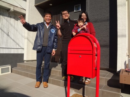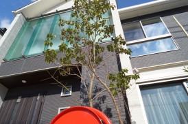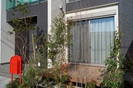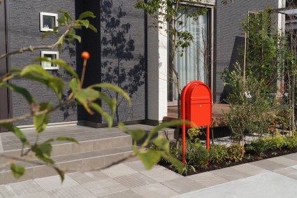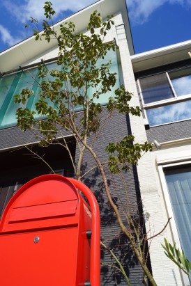 アクセントカラーに入れた赤のポストに建物2階まで伸びるシンボルツリーのソヨゴのあるオープン外構