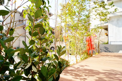 たつの市一条工務店外構工事|緑豊かなフロントガーデンとウッド調のオリジナル門柱のエクステリア