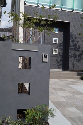 > 高砂市新築外構|おしゃれな住宅のスクエア窓と同じデザインを門柱にも施したガーデンデザイン