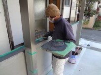 玄関横のFIX窓のデザインと門柱のスリットを同じバランスで空けて統一感を出しています。