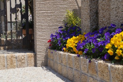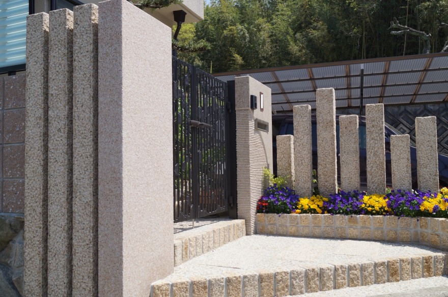 オリジナルで作成したミカゲ石の石門柱は重厚で上質な門廻りになりました、門柱の袖には高さの異なる石柱でモダンさをプラスさせピンコロの花壇や登りやすい階段などアプローチは洗い出しで仕上げています。