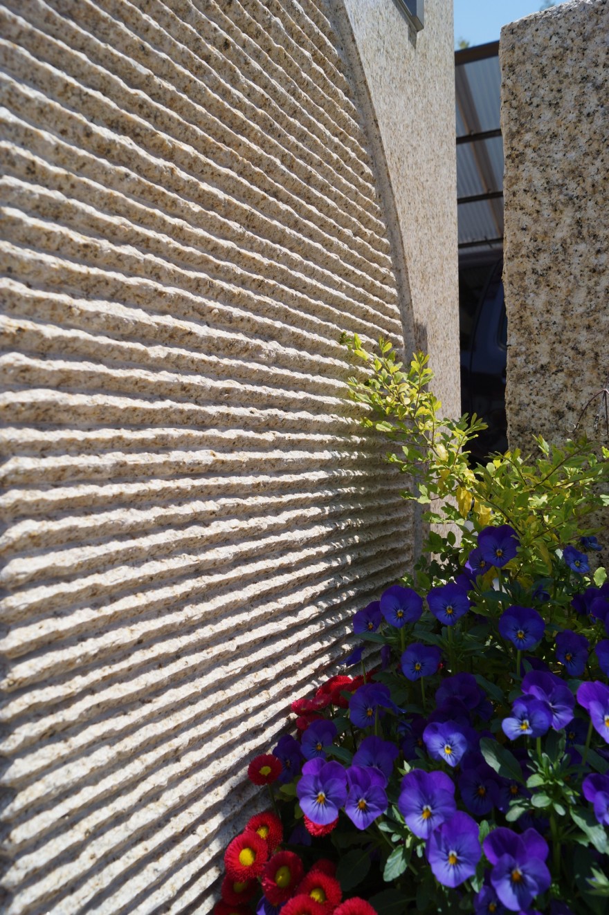オリジナル門柱にラインを入れて石の表情に変化をもたらしています。