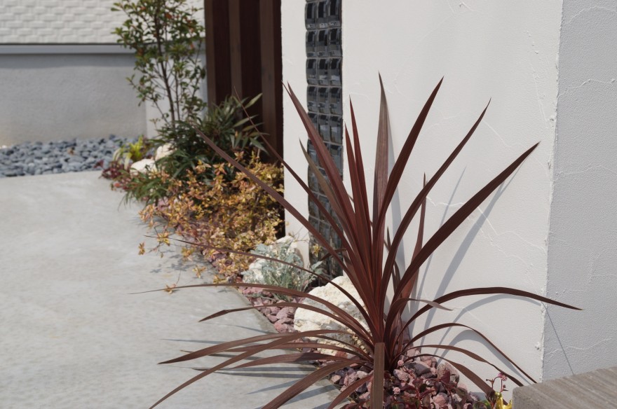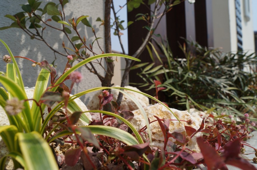 門周りの植栽にはフイリヤブラン、姫シャリンバイ、マホニアコンフーサ、ニューサイラン、ヒメツルソバなどのグランドカバーに沖縄の琉球石でロックガーデン風に仕上げエッジ部分にはブラウン系の化粧砂利でまとめています。