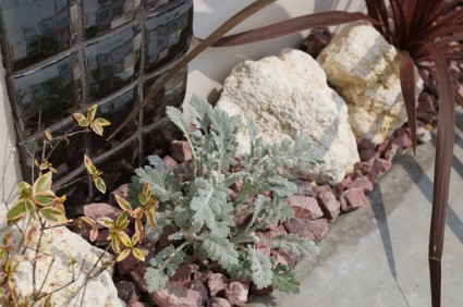 門柱の足元のロックガーデン