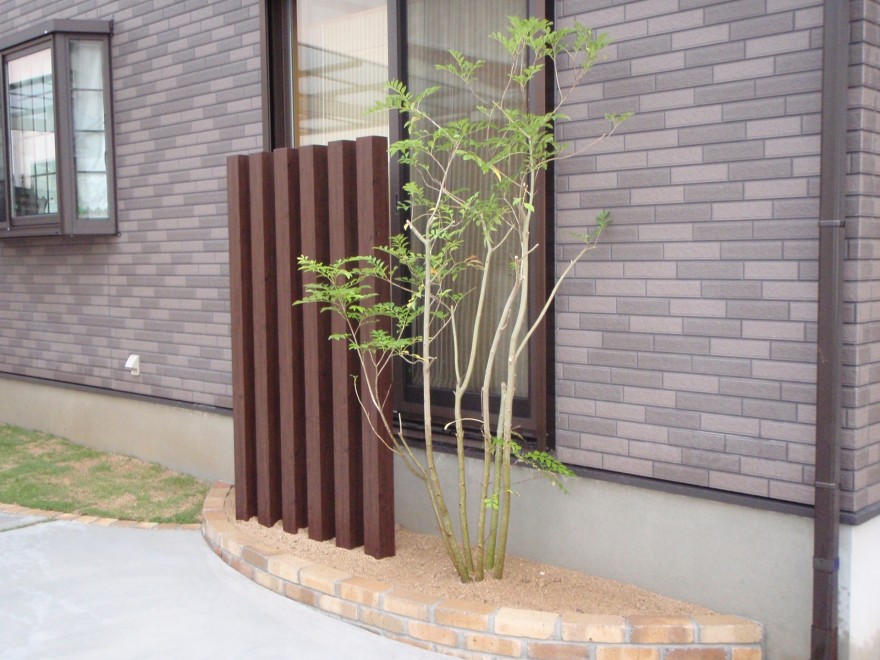 既設の壁に白の塗り壁で清潔感あふれる背景をつくりできる限り緑を取り入れたいというご要望にお応えしてレンガで曲線を描いて芝生と植栽スペースを作りました。