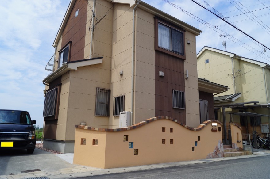 奥様の夢だったレンガで縁取った曲線の塀に奥様の大好きなガラスブロックをアクセントにちりばめて乱形の自然石はりなど優しい色づかいのエレガントさを表現しています。