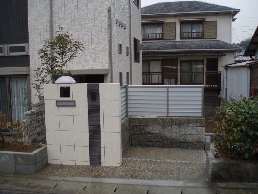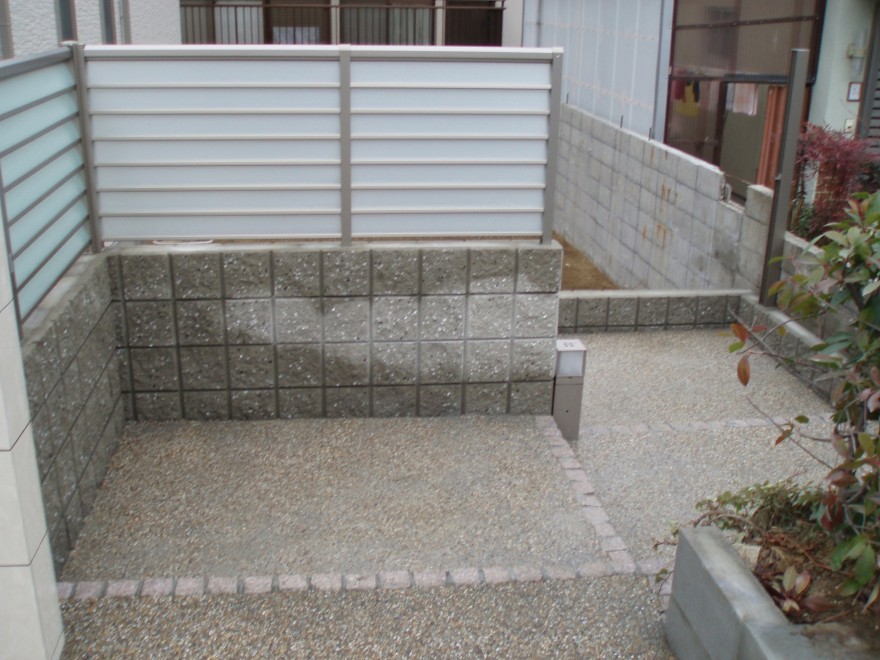 ブロックを積み上げて目隠しのフェンスを取り付け直接玄関が見えないように工夫しています。