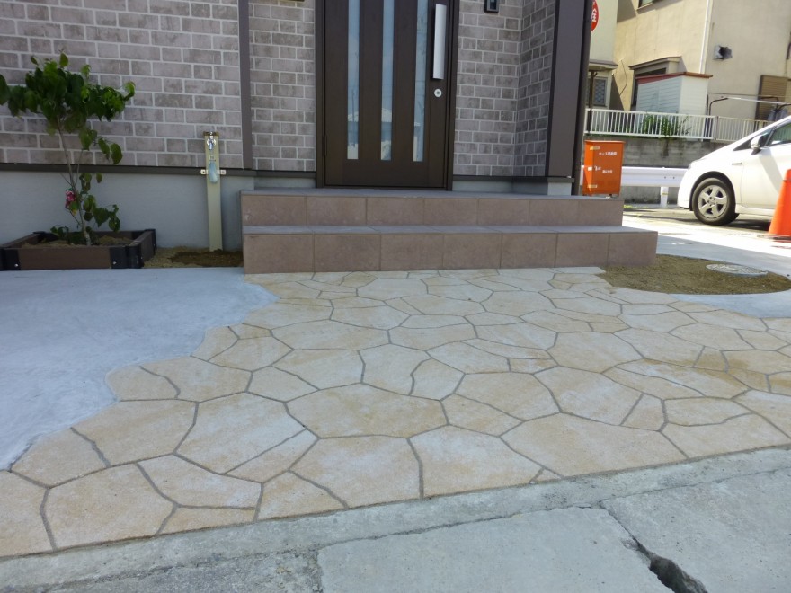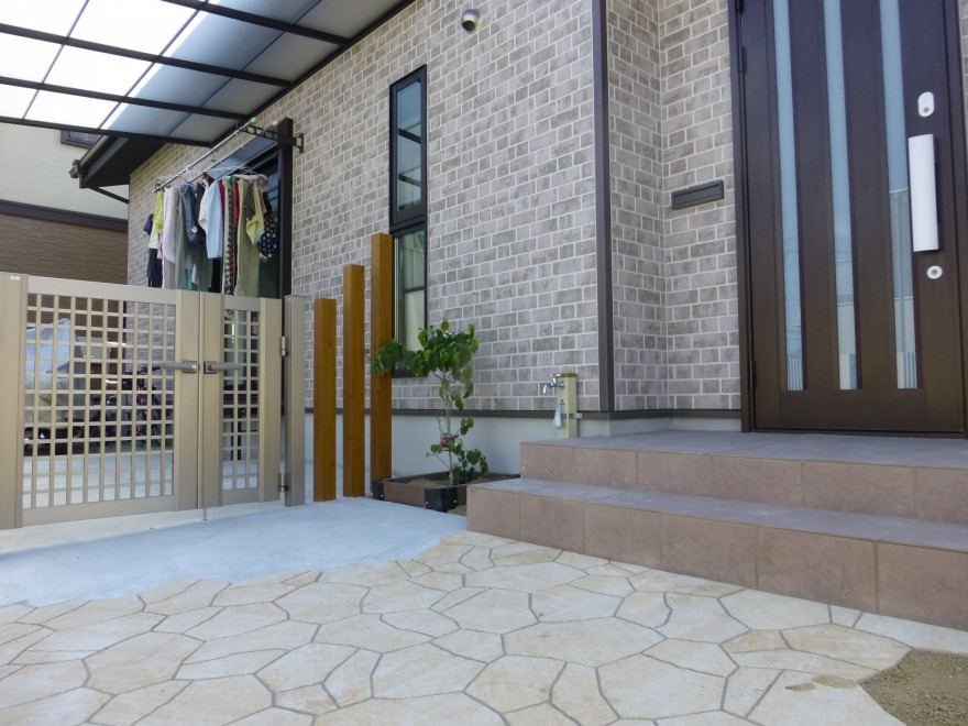 オープンな門回りにユニソンのティーナ乱石風を敷き詰めした。