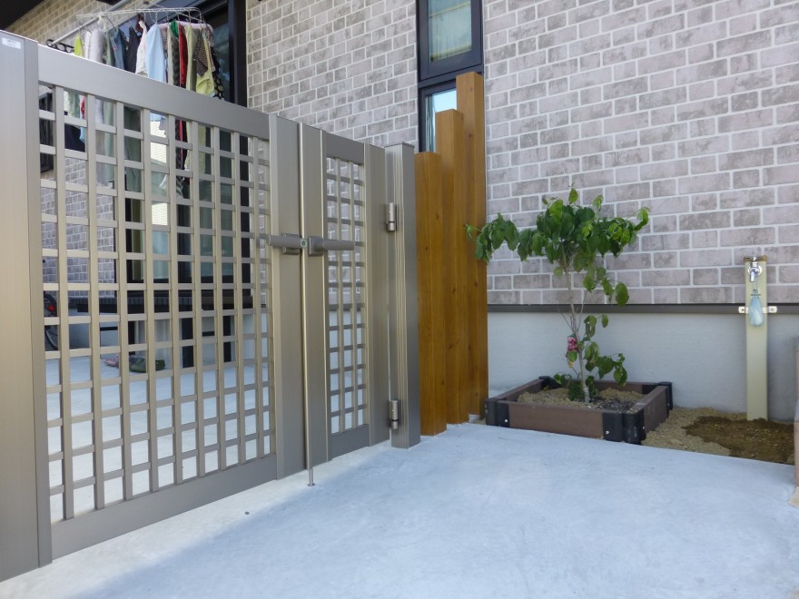 テラスにはバイクや自転車置場も兼ねているので防犯上門扉とアクセントにアルミ木目調の角柱を並べました。