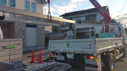 大型梁をサンガーデンのユニックで