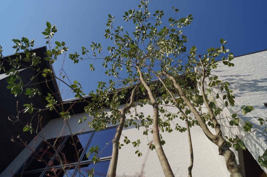 その白い壁に映える樹木ソヨゴをシンボルツリーにしました。