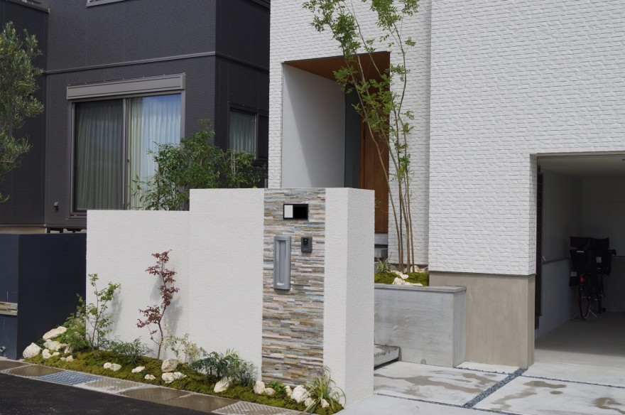 ナチュラルストーンのボーダーストーンがアクセントになった門周り