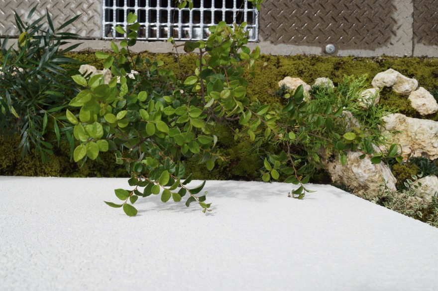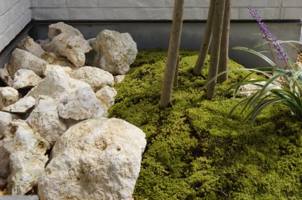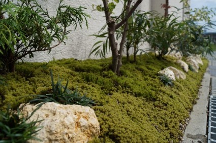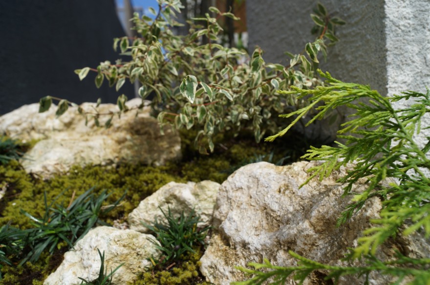 土留めも兼ねたロックガーデンにはスナコケをベースにリュウノヒゲなどをところどころに植えてグリーンの濃淡も楽しめます。