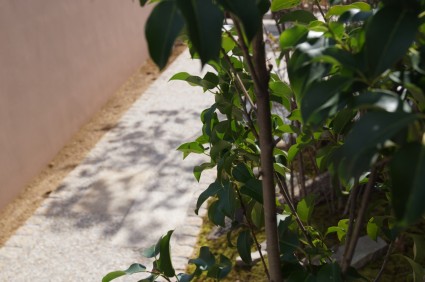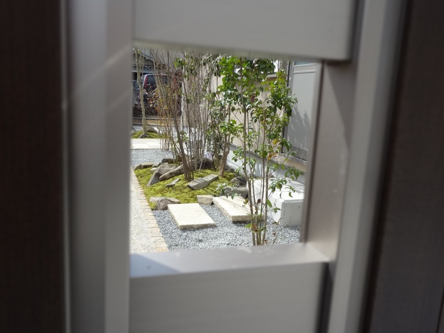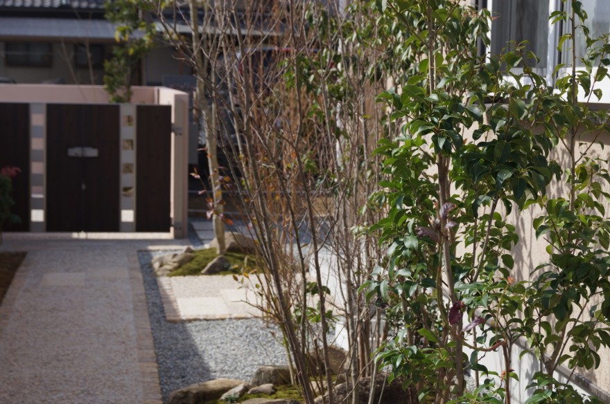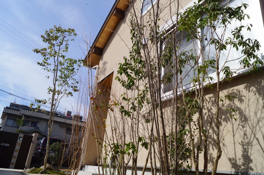雑木林を感じさせてくれる木々たちは春夏秋冬にそれぞれの季節感を感じさせてくれて、自然なイメージで目隠しと日差しを窓から感じさせてくれる構成です。