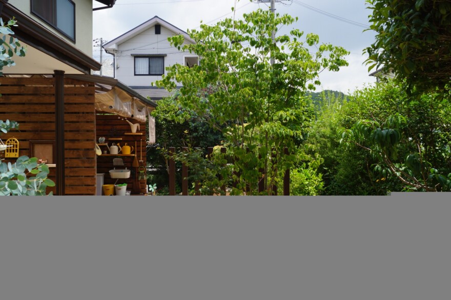 タイルテラスの目線が気になるところにヤマボウシを植えて目隠しの目的も兼ねた植栽です。