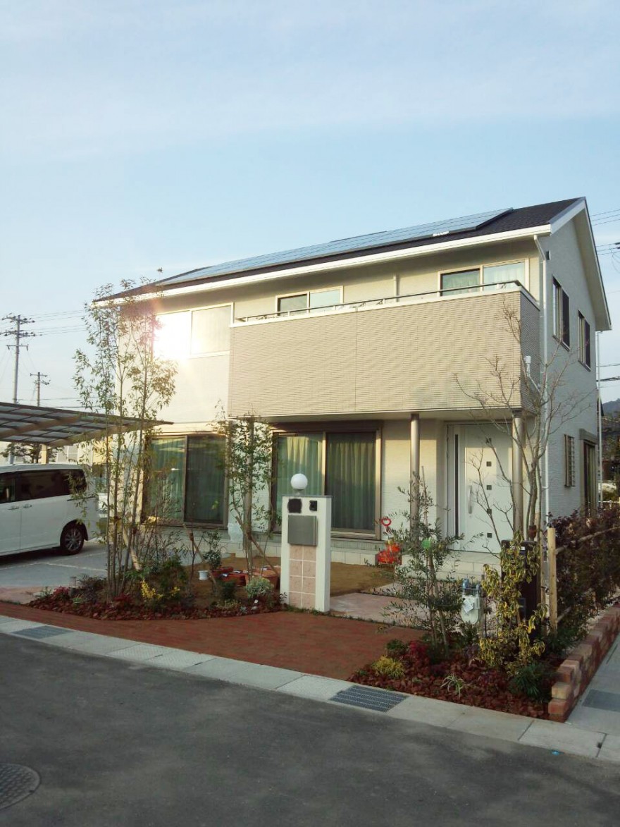 オープン外構の植栽工事でシンボルツリーにソヨゴの株立ち、境界部分には赤花と白花のトキワマンサクの生垣を植栽。