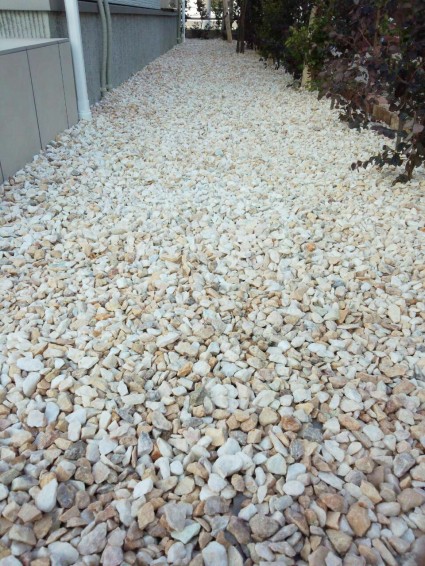 境界の生垣の裏側は防草シートを敷いて化粧砂利仕上げ